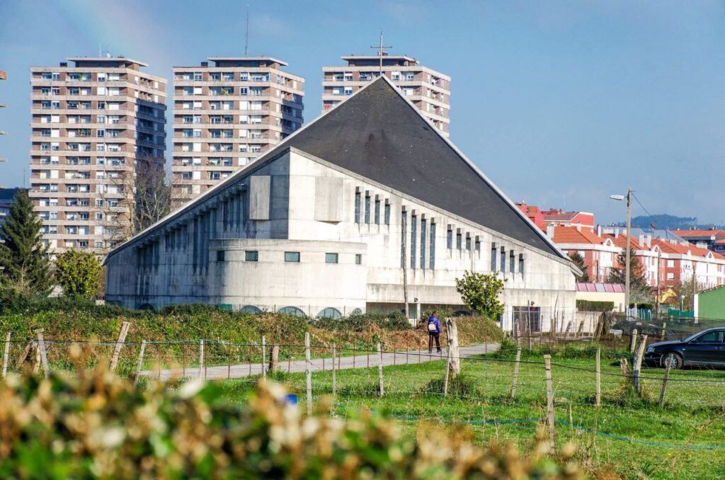 Su diseño sorprende por su sobriedad: líneas rectas, geometrías limpias y muros de hormigón que evocan el funcionalismo centroeuropeo de mediados del siglo XX. Nada que ver con los templos cántabros tradicionales, donde abundan las torres barrocas, las fachadas de piedra tallada o los ecos del estilo montañés. Aquí lo que domina es una estética casi brutalista, austera y contundente, que desconcierta a quien la contempla por primera vez.