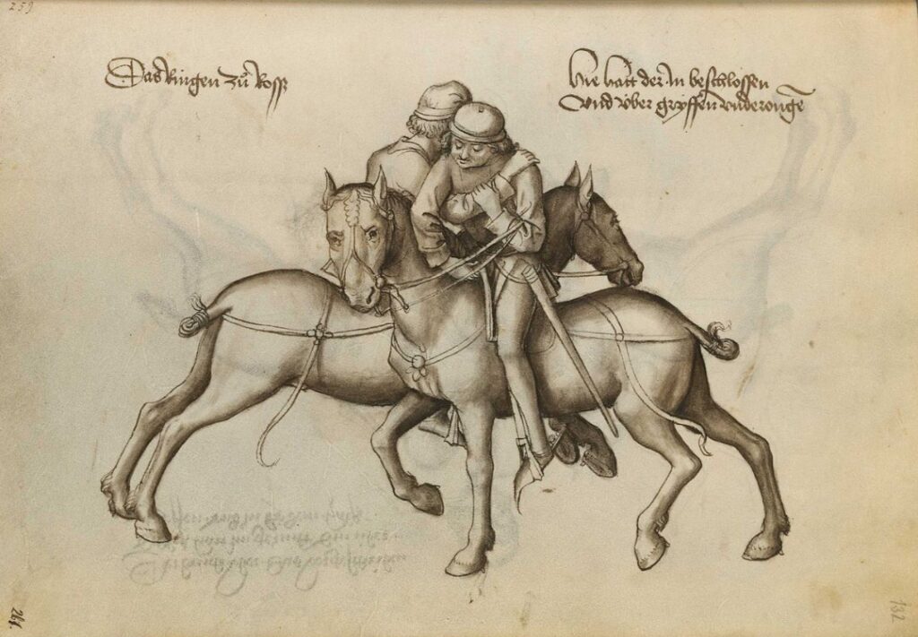 También existía el Ringen montado, que se realizaba desde las grupas de las monturas, ya que era frecuente que los jinetes se arrimasen a una distancia en la que podía ser más efectivo sujetar o desequilibrar que golpear con un arma.
