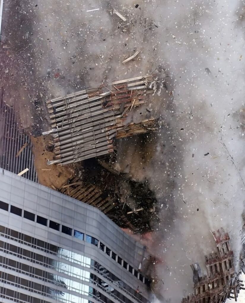 En las dos tomas siguientes, el edificio aparece partido en dos tras el derrumbe de la torre. Bomberos informaron haber hallado restos humanos y cuerpos en la azotea, correspondientes a personas que habían caído o saltado desde la cara sur de la Torre Norte. Al menos diez compañías de bomberos utilizaron el vestíbulo como punto de reunión; es probable que muchas de ellas no fueran destinadas allí oficialmente, sino que terminaran en el lugar debido a la confusión generada durante la evacuación.