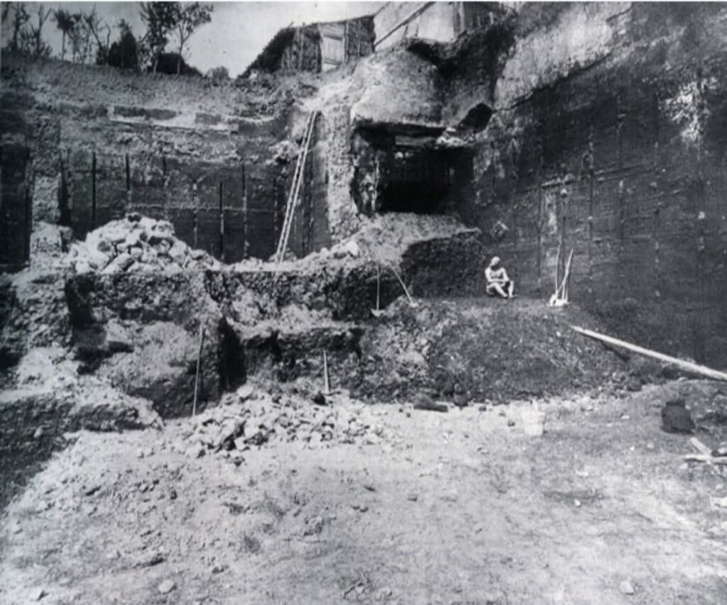 La antigua línea costera de Herculano está sepultada bajo aproximadamente 20 metros (unos 65 pies) de material volcánico depositado durante la erupción del Vesubio en el año 79 d. C. Esta enorme masa de escombros puede verse a la derecha. Cuando se excavó este sector, se encontraron más de 300 víctimas, la mayoría apiñadas en los cobertizos para barcos (indicados con etiquetas). Dado que muchas personas esperaban escapar del desastre por mar, cabe preguntarse cuántos más esqueletos quedarán por descubrir a lo largo de los kilómetros de costa antigua que todavía permanecen sepultados bajo los depósitos volcánicos.