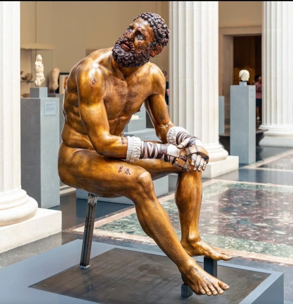 El Púgil en reposo se data de forma amplia entre 330 y 50 a. C., un periodo en el que los artistas helenísticos desarrollaron un interés profundo por la representación del cuerpo humano en situaciones extremas. Lejos de los ideales clásicos de perfección y serenidad, este bronce muestra a un atleta exhausto tras un combate. Su posición descansada, su respiración fatigada y la tensión contenida en los músculos transmiten una humanidad tangible y casi íntima.