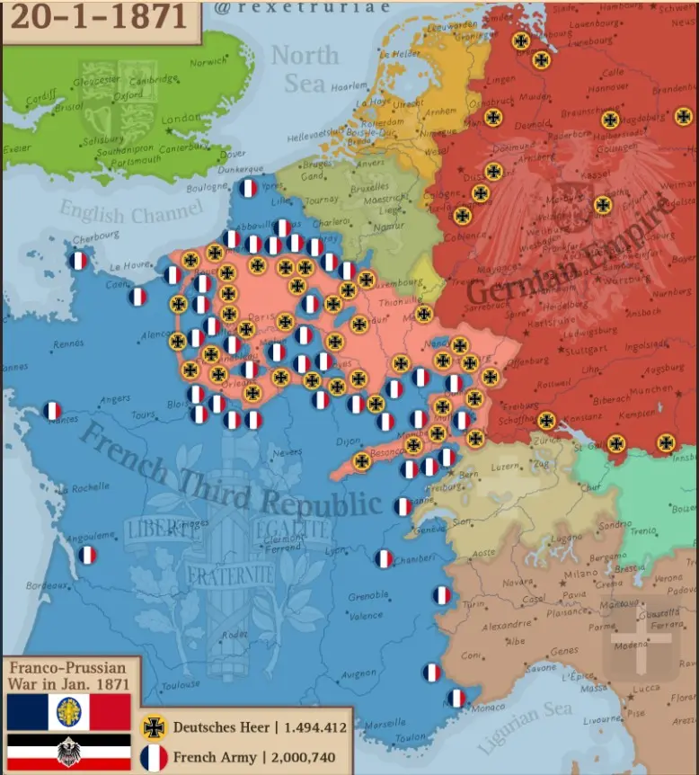 La guerra franco prusiana de 1870-1 no estaba marchando bien precisamente para Francia y el emperador bajo cuyo mandato se habían producido las apariciones de Lourdes fue depuesto y tomado prisionero en el mismo campo de batalla por el enemigo, que destrozó en ocasiones consecutivas al ejército galo mientras no dejaba de avanzar hacia el interior del país. Como vemos en la imagen, el desastre galo era absoluto y las fuerzas germanas tenían las mejores perspectivas de seguir progresando y ocupando el país invadido. En la imagen vemos la situación 3 días después de la aparición de Pontmain y a escasa semana de la firma del Armisticio.
