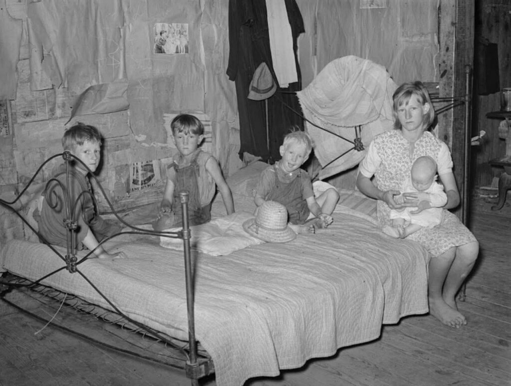 En 1939, al norte de Sallisaw, Oklahoma, los hijos de un jornalero agrícola posan en el interior de su humilde vivienda. Las paredes, cubiertas con papel para proteger del frío y el polvo, revelan la precariedad del hogar. Los niños, sentados juntos sobre una única cama, visten ropas desgastadas y van descalzos, símbolo de la dura pobreza que azotaba a las familias campesinas durante los años del Dust Bowl, cuando la sequía y la crisis económica devastaron gran parte del medio rural estadounidense.