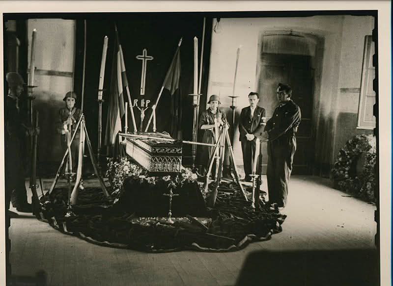 Imagen: féretro escoltado por cinco soldados; sobre un gran mantón que cubre el soporte del féretro, el sable, la gorra y un crucifijo; a ambos lados, armas dispuestas en trípodes, candelabros, y al fondo, banderas de España y de La Falange junto a otro crucifijo.