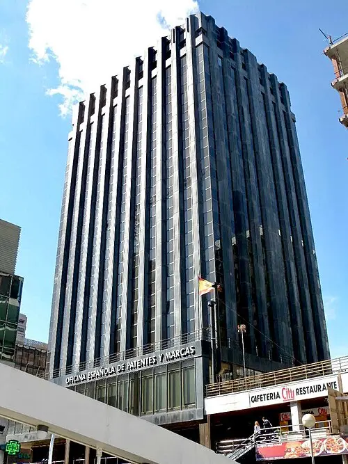 El antiguo edificio del Banco Santander, apodado la Torre Negra, perteneció al Banco Santander Central Hispano (denominación que tenía el Banco Santander) hasta 2003 cuando fue vendida, y se instaló la Oficina de Patentes y Marcas. Fue construida en 1978 y cuenta con 19 plantas (más 5 más subterráneas). Su arquitecto es José Antonio Ridruejo.