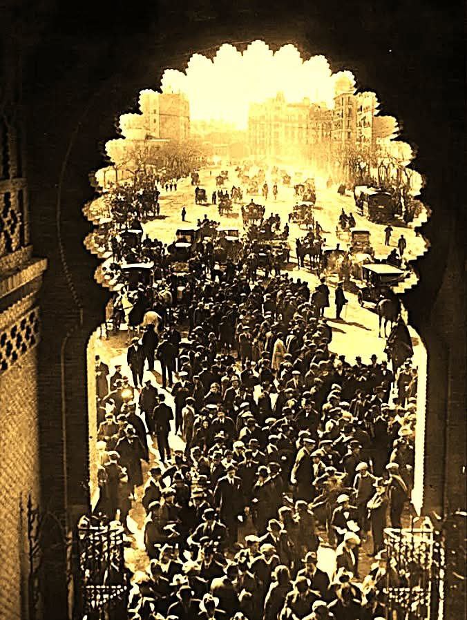 Vista de la llegada y entrada de aficionados a la «tauromaquia» a la plaza de toros de Goya, la plaza de Las Ventas, en 1932. Se puede observar la transición del caballo al automóvil.