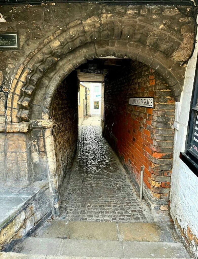 Se cree que fue una “postern”, o puerta para caballos de carga, en las antiguas murallas de la ciudad. Se abría para permitir la entrada y salida de comerciantes, pero podía bloquearse rápidamente si era necesario. De algún modo, terminó en este callejón entre casas, una característica inusual que normalmente solo se ve como un arco del presbiterio en una iglesia. Es sorprendente lo que uno puede notar cuando camina despacio y se fija en todo lo que le rodea — a mí me gusta dar un buen paseo sin prisas.