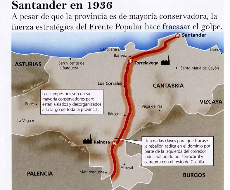 Como podemos ver en esta imagen, el corredor ferroviario y por carretera entre la Meseta y Santander conectaba una importante ruta económica para nuestro país. De hecho, apenas acabada la guerra se utilizaron las cuadras para el cambio de tiro de las carretas que subían el puerto de Carrales para meter ahí los camiones que hacían la misma ruta, crucial para los intercambios comerciales y de todo tipo entre la costa cantábrica y la provincia de Burgos y otros territorios de la Meseta. Por esto el Frente Popular se tomó muy en serio y actuaron con bastante eficacia en controlar esa ruta desde un principio de la guerra y evitando que los nacionales se hicieran fuertes en la provincia de Santander y condenasen al fracaso la revolución asturiana y la independencia de facto de Vizcaya, con su propia República funcionando por su parte.