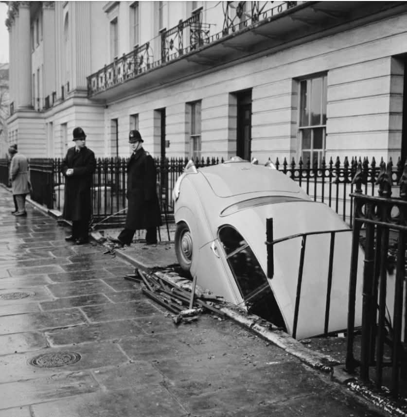 El insólito panorama del coche atrapado en el foso, rodeado de barrotes retorcidos y aceras destrozadas, atrajo rápidamente a transeúntes curiosos y a dos agentes de policía que intentaban ordenar la escena. Aquel instante quedó inmortalizado en fotografías en blanco y negro que transmiten una mezcla extraña entre tragedia y espectáculo cinematográfico.