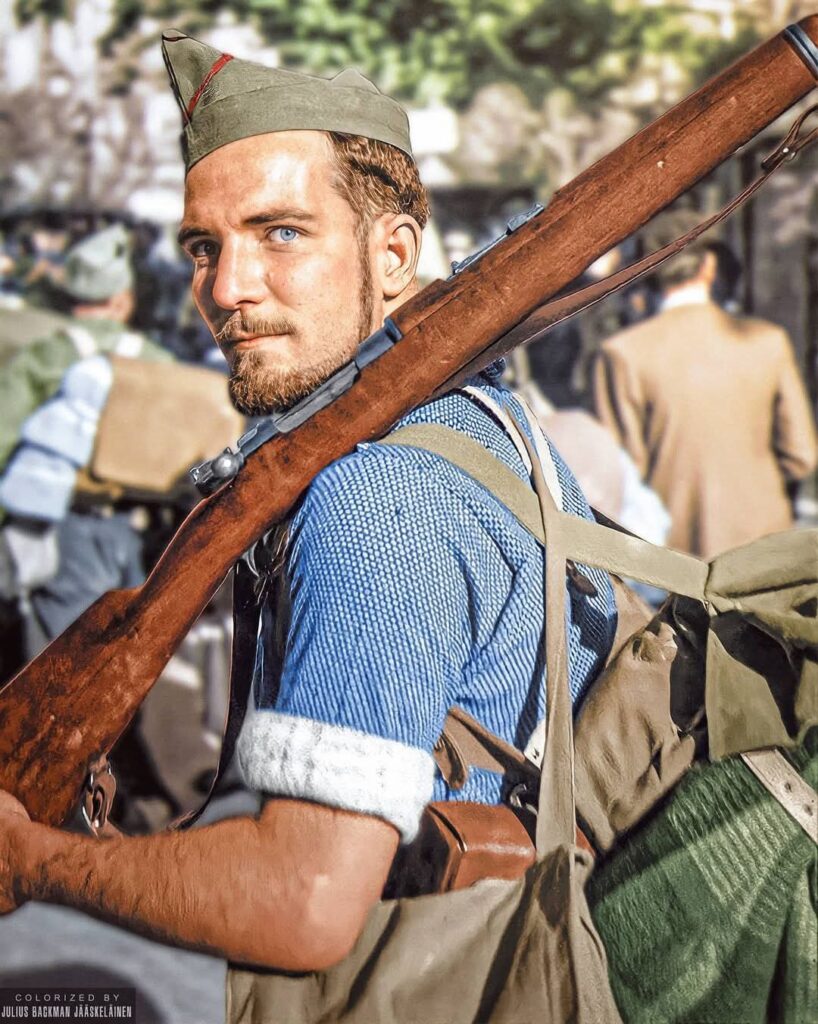 Miliciano frentepopulista desfila en Barcelona. El armamento (rifle Mauser reglamentario, por ejemplo) y el gorro de soldado español son casi idénticos en ambos bandos.