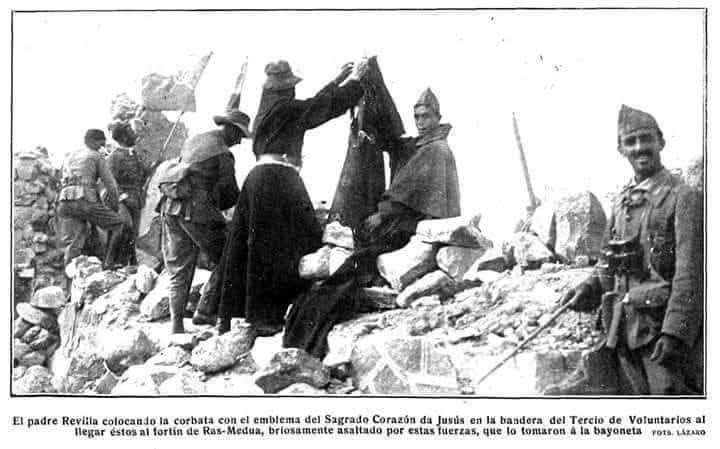 Asimismo, se describe la siguiente disposición en las unidades rebeldes: un moro, un regular y, detrás de los tres, un falangista y un requeté, pistola en mano, que dispara a la menor vacilación.